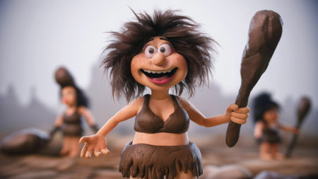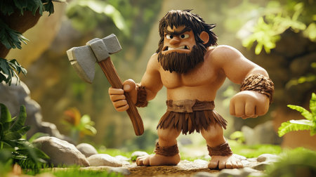 A cartoon caveman holding a stone ax, his expression fierce and determined, standing in a prehistoric world