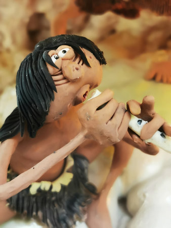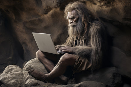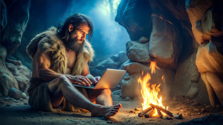 Primitive man sitting in the cave and trying to typing on the laptop.