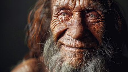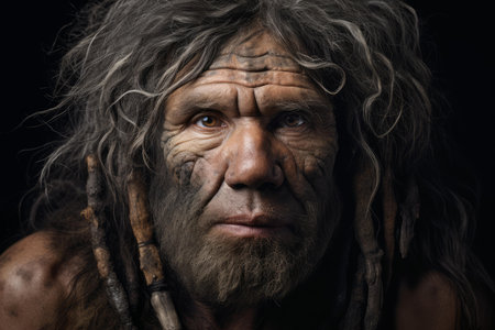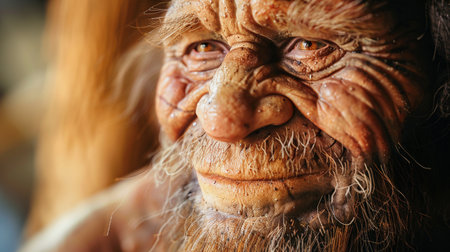 Portrait of prehistoric man in cave. Face of Neanderthal caveman with beard. Ancestor of mankind. Created with Generative AI