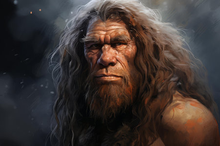 Neanderthal with wild hair and a primal expression of astonishment or fear, set against a dark, subdued background