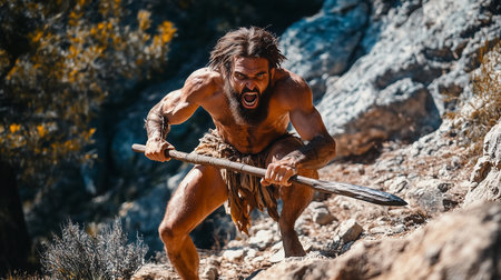 Portrait of Primeval Caveman Wearing Animal Skin and Fur Hunting with a Stone Tipped Spear in the Prehistoric Forest. Prehistoric Neanderthal Screaming, Threatening and Attacking