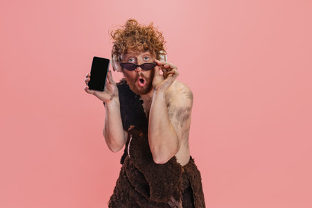 Portrait of man in character of neanderthal in stylish sunglasses holding phone in shock isolated over pink background