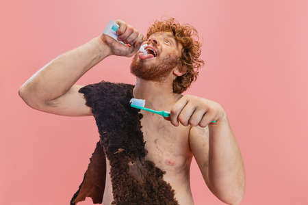 Portrait of man in character of neanderthal squeezing tootpaste into mouth isolated over pink background