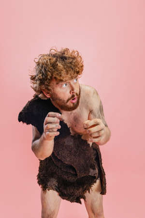 Cropped portrait of man in character of neanderthal wearing animal skin cloth standing in fear isolated over pink background