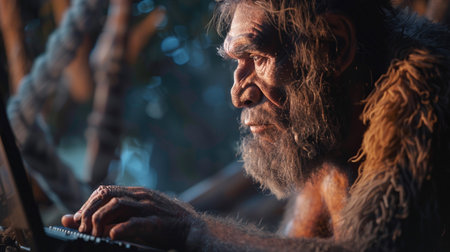 A primitive man in his cave sits in front of a laptop. He types on the keyboard and concentrates on his work. The concept of solitude and concentration.