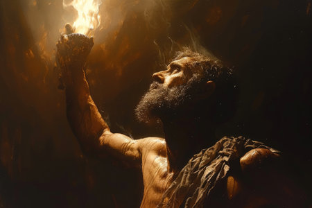 Ignite enlightenment: prometheus, the Olympian god, holds fire in hands, symbolizing defiance and the gift of knowledge, a mythic embodiment of empowerment and rebellion.