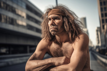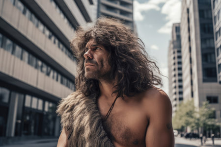 Portrait of prehistoric neanderthal man at city street in present time. Adaptation of ancient man in modern society. Created with Generative AI