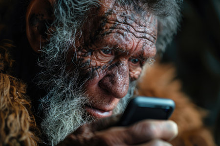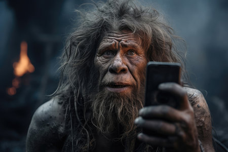wildman caveman holding mobile phone, smartphone, technology development concept