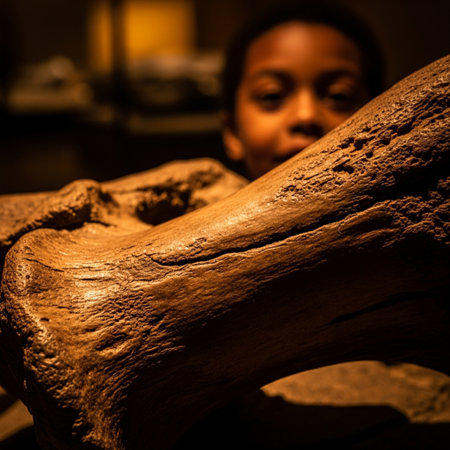 Weathered fossilized bone lies on a mosaic tile floor, hinting at archaeological finds and paleontological research, sparking curiosity about extinct species and prehistoric life