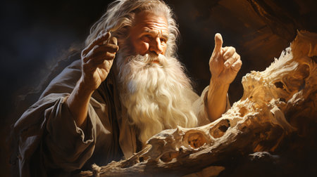 Portrait of prehistoric man in cave. Face of Neanderthal caveman with beard. Ancestor of mankind. Created with Generative AI