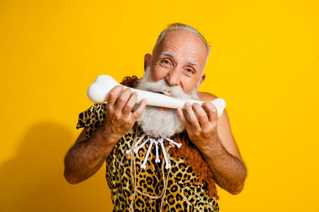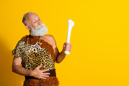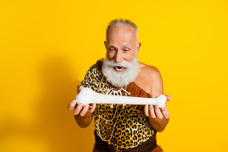 Photo of excited funny cave human wear leoprad skin enjoying animal bone emtpy space isolated yellow color background
