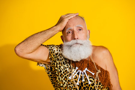 Portrait primeval caveman hand touch head wear leopard skin clothes isolated on yellow color background