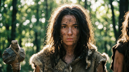 A close-up of a young cavewoman with a dirty face and fur clothing, staring intensely at the camera. She stands in a lush, green forest with strong backlighting.