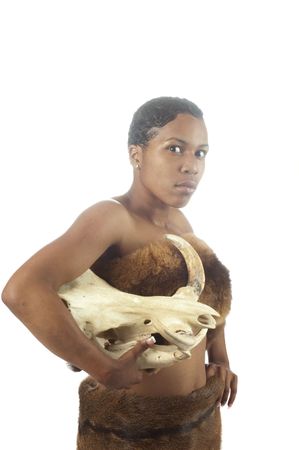 Cave primitive man in animal skin with a spear. Copy space for text. Copy space for text