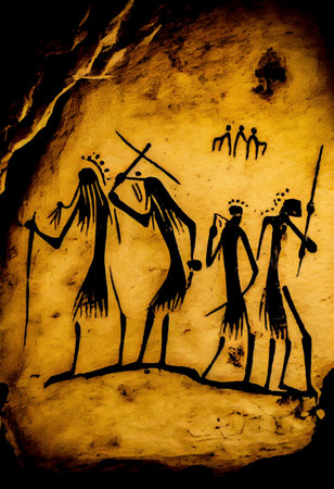 Hunters walking with spears depicted in ocher colors on a cave wall, showcasing prehistoric art and human history
