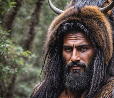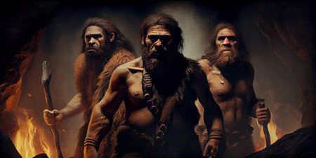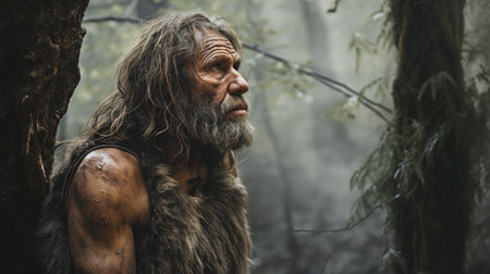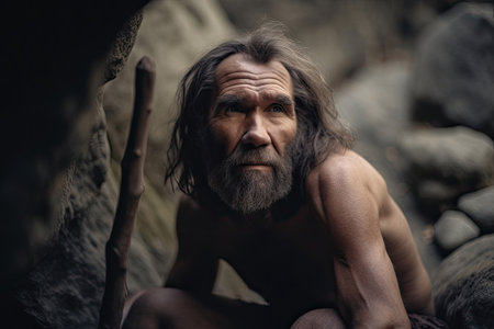 Portrait of prehistoric man in cave. Face of Neanderthal caveman with beard. Ancestor of mankind. Created with Generative AI
