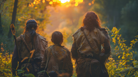 An evocative scene of three hunter-gatherers in animal skin, gazing at a sunrise through a dense forest, capturing the essence of early human life.