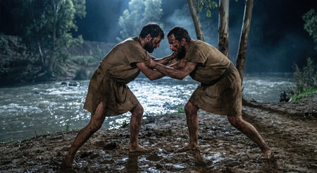 Jacob struggles with a figure at night near a riverbank. Both figures appear determined as they grapple in the mud under the dim light from the sky and trees.