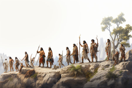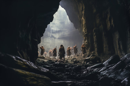 A group of ancient cavemen and women dressed in animal skins and holding spears, representing a Stone Age community in their natural habitat.