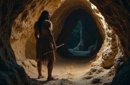 A caveman stands inside a dimly lit cave, dressed in rustic clothing made of animal fur..