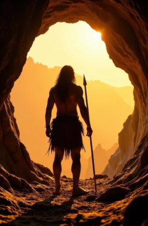 Standing at the mouth of a cave a warrior with a spear admires the breathtaking sunrise. The rugged mountains create a dramatic backdrop enhancing the rugged beauty of the scene..