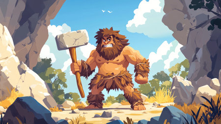 A cartoonish caveman in animal skins wields a stone ax, surrounded by ancient rocks and primitive scenery
