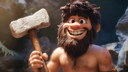 A smiling caveman cartoon character grips a stone ax, with a simple yet comical expression, in a rugged environment