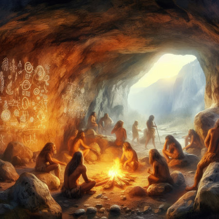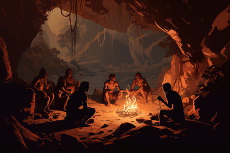 Cave people gather around a flickering fire in a dim cave, sharing stories and socializing in a prehistoric setting that emphasizes community