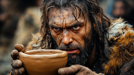 A man dressed as a Neanderthal with a look of shock, exhibiting wide eyes and an open mouth, conveying a sense of primitive surprise and wonder