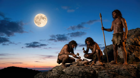 A scene from the Stone Age showing three primitive humans. One stands guard with a spear while two others craft tools on a rocky outcrop under a dramatic full moon sky.