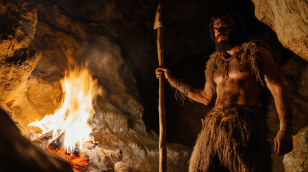 prehistoric caveman standing by a fire inside a cave, holding a spear, wearing fur clothing, and gazing into the flames with intensity.