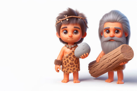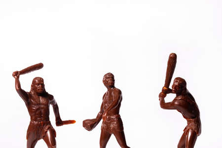 Large toy figures of primitive people on a white background.