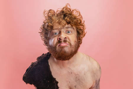Portrait of man in character of neanderthal squeezing tootpaste into mouth isolated over pink background