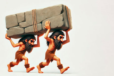 Cavemen carry a heavy stone. Space for text