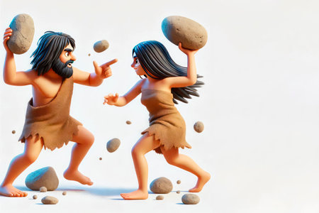 A quarrel between a primitive couple with stones in their hands. Space for text