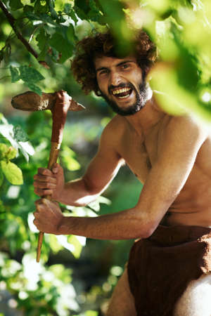 Time for hunting. An aggressive caveman holding an axe.