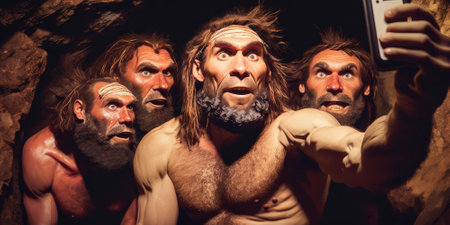 Group of prehistoric human or neanderthal taking selfie picture with mobile phone in funny emotion. superlative generative AI image.
