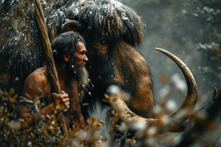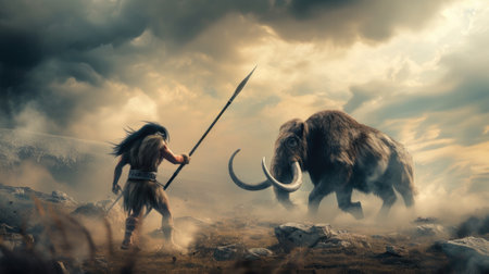Neanderthal man holding spear stands against woolly mammoth, primitive hunter and animal in prehistoric era. Concept of caveman, ancient people, epic fight, Stone Age and human. Generative AI