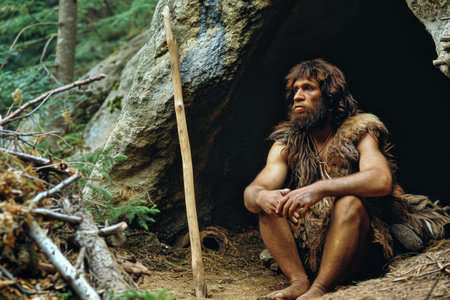 Neanderthal man in the forest, uncivilized, unintelligent, or uncouth