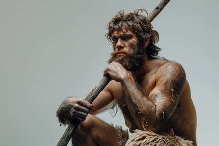 Caveman in animal skin with a spear. Copy space for text