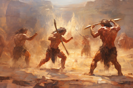 Ancient cavemen in the cave with weapons and stone on dark background