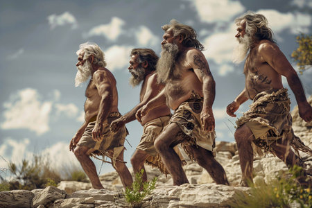 Four men depict early humans, walking together in a natural setting, showing evolution