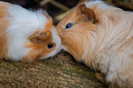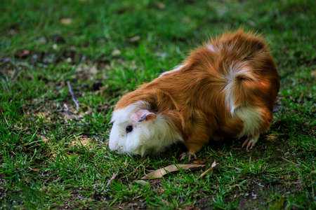 Close-up of white-brown long hair domestic guinea pig cavy in the garden. Lively nature of countryside.