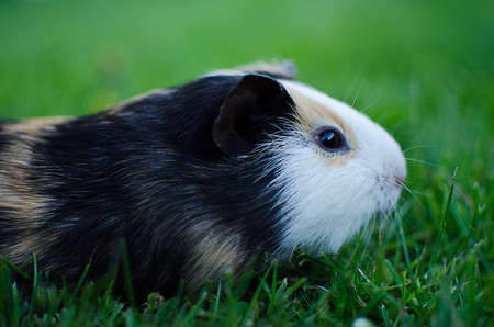 Black Guinea pig sitting outdoors in summer, Pet calico guinea pig grazes in the grass of his owner's backyard, copy space.