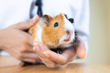 Sheltie guinea pig in a hand pet concept. High quality photo
