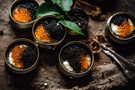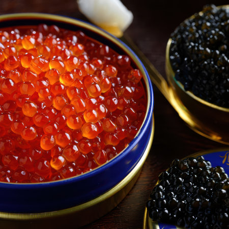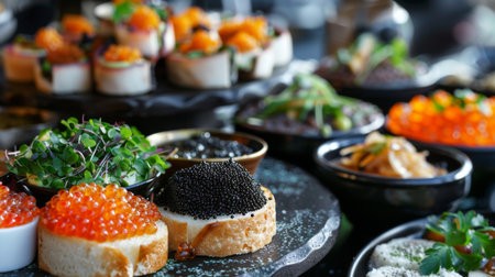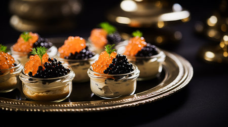 A lavish display of gourmet caviar with vivid orange and rich black pearls arranged beautifully in ornate containers. The luxurious textures highlight a culinary delight at a fine dining event