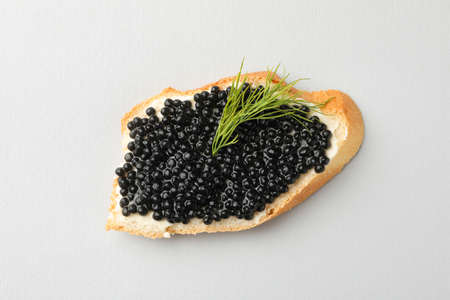 Close-up red caviar sandwich isolated on black background. Salted salmon caviar on wheat bread with fresh dill. Reflection in a shiny surface