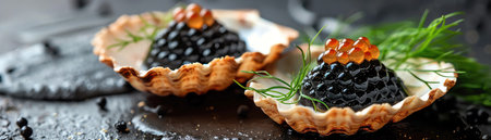 A Gourmet presentation of black caviar served in a scallop shell with dill on a dark, elegant background