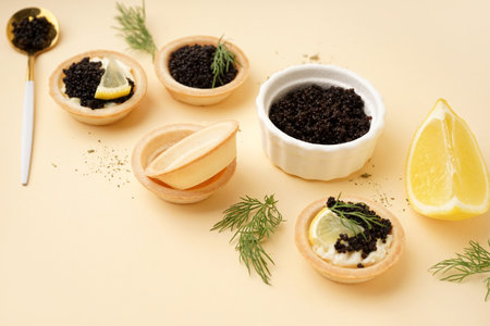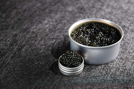 Black caviar served on the table. Exquisite delicacy of black sturgeon caviar.