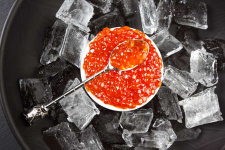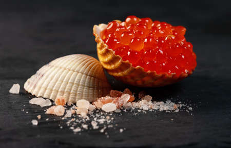 Fresh red and black caviar, seafood, dark background, top view. Good food. Delicious food content